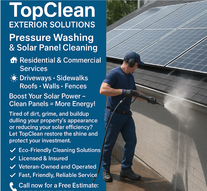 ๐ Bring Back the Shine! ๐ TopClean Exterior Solutions – Pressure Washing & Solar Panel Cleaning ๐ก Residential & Commercial Services ๐งผ Driveways • Sidewalks • Roofs • Walls • Fences โ๏ธ Boost Your Solar Power – Clean Panels = More Energy! Tired of dirt, grime, and buildup dulling your property’s appearance or reducing your solar efficiency? Let TopClean restore the shine and protect your investment. โ Eco-Friendly Cleaning Solutions โ Veteran-Owned and Operated โ Fast, Friendly, Reliable Service ๐ Call now for a Free Estimate: 480-742-5475๐๐ธ Before & After Photos Available! ๐งฝ We don’t just clean — we make it look brand new!